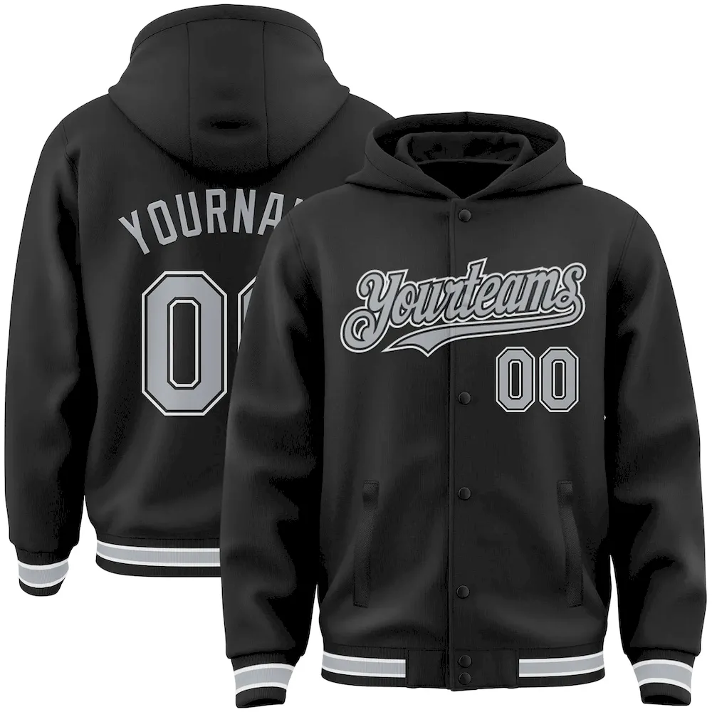 Custom Black Gray-White Bomber Full-Snap Varsity Letterman Hoodie Jacket